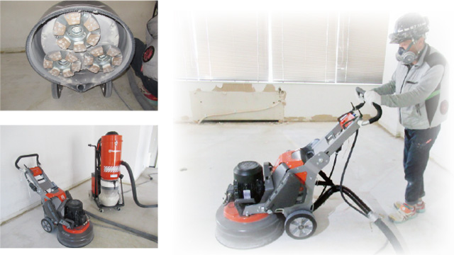 飛散性の低いL3アスベスト含有建材である仕上材塗膜及び下地調整材、ボンド等を大型床用吸引装置付きサンダーにて除去する工法です。