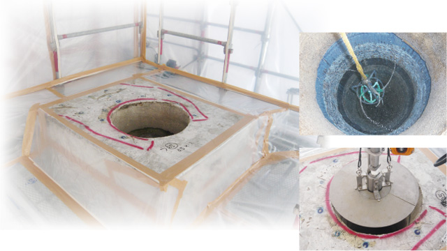 飛散性の低いL3アスベスト含有建材である仕上材及び下地調整材を、吸引装置付き超高圧洗浄にて除去する工法です。