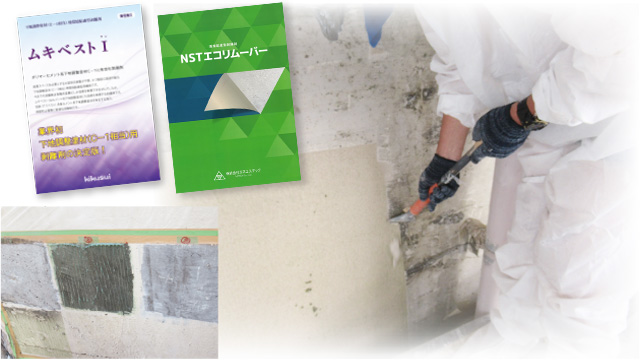 飛散性の低いL3アスベスト含有建材である下地調整材を無機対応剥離剤にて湿潤軟化させ除去する工法です。