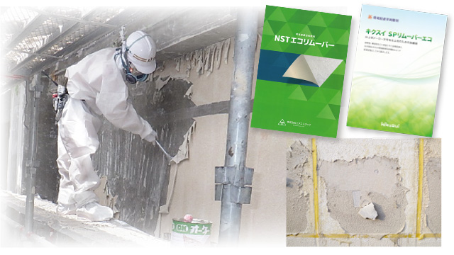 飛散性の低いL3アスベスト含有建材である仕上材及を、環境対応タイプ剥離剤にて湿潤軟化させ除去する工法です。