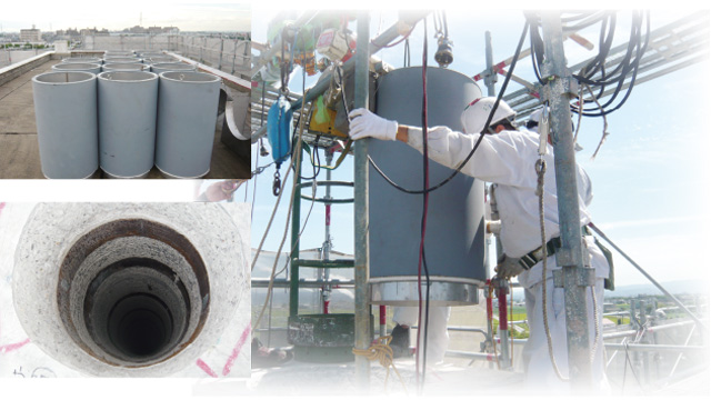 煙突内のカポスタック及びハイスタック等断熱材を除去後、断熱構造の鋼管を挿入し、煙突を再利用する工法です。