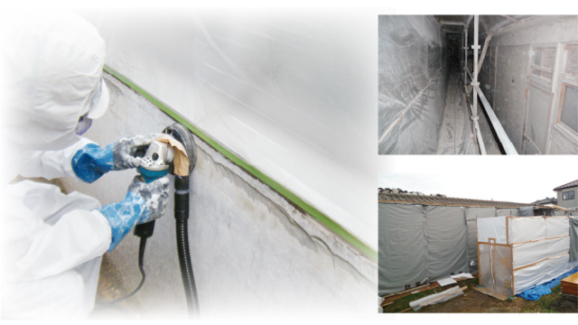 エヌエステックでは、様々な技法と熟練を要する正確な作業の徹底によって有害物処理作業時の確実性・安全性だけでなく、作業効率を高めた粉じん飛散防止処理に努めています。