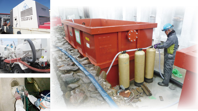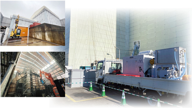 ダイオキシンを負圧隔離環境下にて高圧洗浄機にて除染する工法です。
