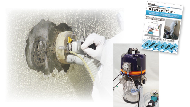 飛散性の低いL3アスベスト含有建材である仕上材及び下地調整材を、NETIS:CG-230005取得の水循環吸引装置付携帯サンダーにて湿潤除去する工法です。